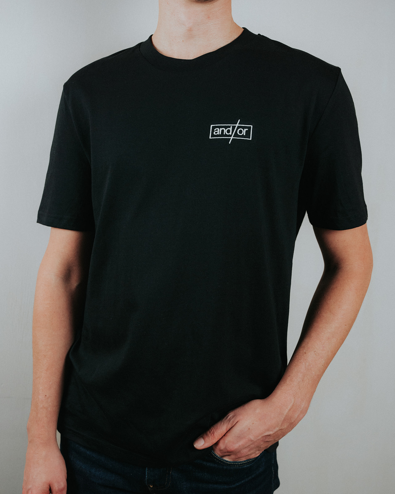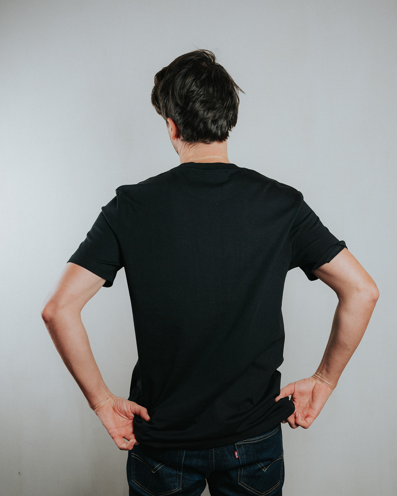 Niels (black T), 184cm, is wearing a size M